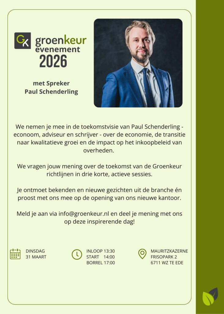 Het evenement biedt volop gelegenheid om bekenden te ontmoeten, nieuwe gezichten te leren kennen en kennis uit te wisselen binnen de branche. Bovendien wordt tijdens deze dag het nieuwe Groenkeur-kantoor feestelijk geopend — een mooi moment om samen het glas te heffen op de toekomst.